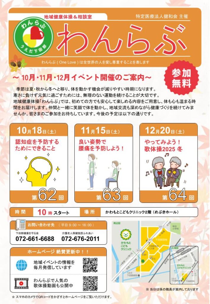 地域健康体操&相談室「わんらぶ」は月1回開催の健康づくりイベントです。告知ポスターで今後3か月の予定日と内容をご案内しています。ご興味のある方は、どうぞお気軽にご確認ください。